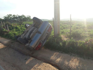 Segundo informações da Polícia Militar, por volta das 16 horas na localidade de Sítio Santa Rita o motorista do veículo modelo Santana, de cor cinza e placas JTW 6848, perdeu o controle da direção do carro e veio a capotar.