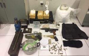 Os policiais foram com Jonatan até o apartamento e lá apreenderam uma submetralhadora calibre .40, dois revólveres calibre 38 – um deles banhado a ouro -, 53 munições de calibres variados, além de 10,5kg de cocaína, 20,8 kg de mineíta (pó branco utilizado no refino do crack), 870 gramas de maconha, 335 gramas de crack e material para fabricação e embalagem dos entorpecentes.
