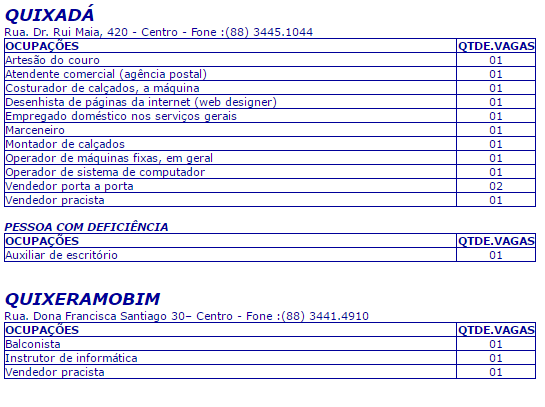 No município de Quixeramobim o Sine localiza-se na Rua Dona Francisca Santiago, 30, Bairro Centro. As informações sobre vagas não são dadas por telefone.