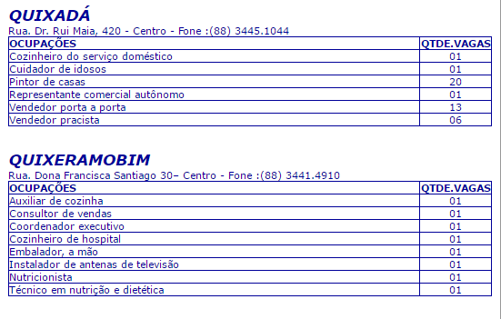 No município de Quixeramobim o Sine localiza-se na Rua Dona Francisca Santiago, 30, Bairro Centro. As informações sobre vagas não são dadas por telefone.