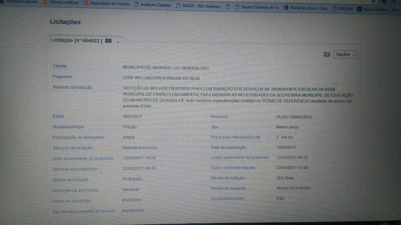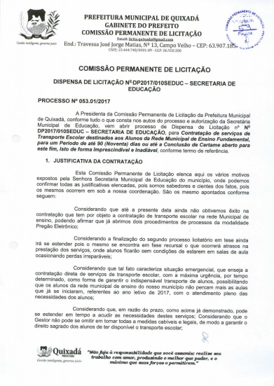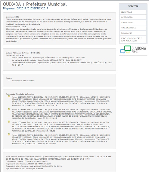 Essa mesma empresa foi declarada pela Prefeitura de Quixadá como vencedora do pregão eletrônico para o serviço de transporte escolar no município, mesmo não apresentando o menor preço para a prestação do serviço.