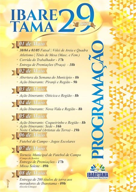 No próximo dia 08 de maio, o município de Ibaretama comemora 29 anos de emancipação política, este ano, o resgate das tradições será o foco das comemorações, bem como a prestação de serviços à comunidade nos distritos e na sede do município. Neste sábado (29), a Prefeitura Municipal divulgou a programação oficial das comemorações de 29 anos da cidade.