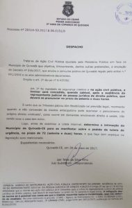 De acordo com o despacho, o juiz intima “o Município de Quixadá-CE para se manifestar sobre o pedido de tutela de urgência, no prazo de 72 (setenta e duas) horas, o que faço com espeque na legislação suso mencionada”, informa o magistrado no documento com data de 9 de abril.