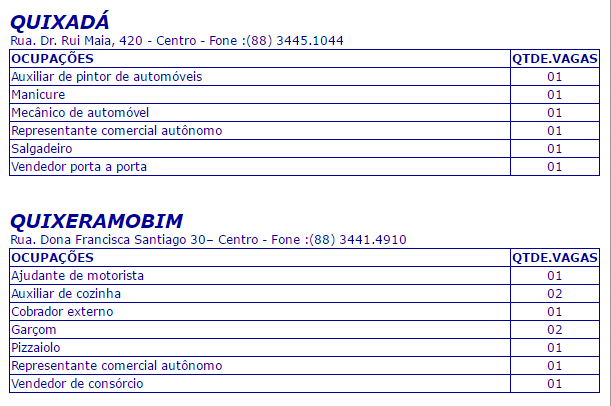 Os interessados em uma das vagas apresentadas na lista deverá se dirigir a uma unidade do Sine/IDT que em Quixadá fica localizada na Rua Dr. Rui Maia nº 420, Centro, e em Quixeramobim na Rua Dona Francisca Santiaga, nº 30, Centro. As informações sobre vagas não são dadas por telefone.