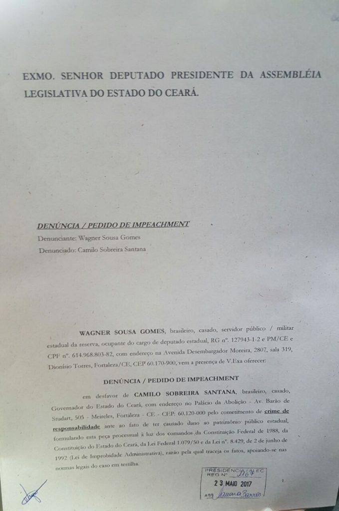 O Deputado Estadual Capitão Wagner protocolou na manhã desta terça-feira (23) na Assembléia Legislativa do Ceará, um pedido de impeachment contra o governador do estado Camilo Sobreira Santana, com base nas delações do empresário Wesley Batista, sócio da empresa JBS.