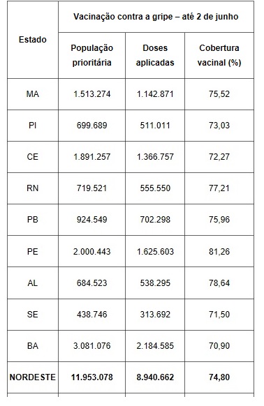 Até esta sexta-feira (02), 41,3 milhões de pessoas do público-alvo se vacinou contra a gripe no país. O Amapá é o único estado que atingiu a meta até este momento, com 95,6% do público-alvo vacinado. A campanha foi prorrogada para até o dia 9 de junho com o intuito de alcançar a meta de vacinação que, neste ano, é de 90%.