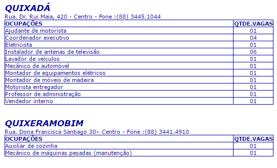 Os interessados em uma das vagas apresentadas na lista deverá se dirigir a uma unidade do Sine/IDT que em Quixadá fica localizada na Rua Dr. Rui Maia nº 420, Centro, e em Quixeramobim na Rua Dona Francisca Santiaga, nº 30, Centro. Importante ressaltar que não serão repassadas por telefone, as pessoas devem se deslocar até um dos escritórios do Sine.
