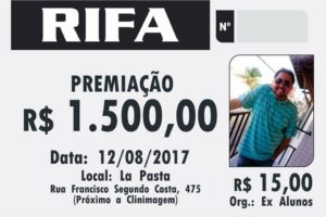 A rifa começará a ser vendida nesta quinta-feira (15), no valor de R$ 15,00 (quinze reais) e a premiação será a importância de R$ 1.500,00 (hum mil e quinhentos reais). O sorteio será realizado dia 12 de agosto do corrente ano