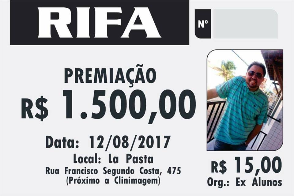 A rifa começará a ser vendida nesta quinta-feira (15), no valor de R$ 15,00 (quinze reais) e a premiação será a importância de R$ 1.500,00 (hum mil e quinhentos reais).