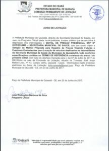 De acordo com o Portal da Transparência, do Tribunal de Contas dos Municípios, deverá ser realizado no próximo dia 07 de julho um pregão presencial de nº PP2017/033SMS/2017 que tem como objeto a Seleção de Melhor Proposta para Registro de Preços Visando Futuras e Eventuais Contratações para Locação de veículos destinados as necessidades da Secretaria Municipal de Saúde do Município de Quixadá/CE. Neste novo processo licitatório a prefeitura pretende alugar uma ambulância tipo resgate por R$ 137.199,99 (cento e trinta e sete mil cento e noventa e nove reais e noventa e nove centavos) valor bem abaixo dos R$ 432.000,00 (quatrocentos e trinta e dois mil reais) que a prefeitura pretendia gastar anteriormente. Existem casos em que prefeituras já teriam comprado uma ambulância semelhante a essa por um valor inferior a R$ 200.000,00 (duzentos mil reais).