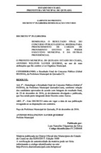 Esqueceu o atual gestor municipal que o prefeito anterior Wellington Xavier em seus últimos dias de gestão assinou o decreto Nº 29.12.001/2016 em que homologa o resultado final do concurso público para preenchimento de cargos de provimento efetivo do poder executivo municipal. Importante ressaltar que a homologação consiste na publicação em meio oficial do governo – neste caso o Diário Oficial – da relação de candidatos classificados no concurso público. Teoricamente, a Banca Examinadora poderá publicar, por exemplo, em seu site, quantos Resultados Finais quiser. Porém, no momento que publica no Diário Oficial, a relação de candidatos, o concurso é considerado homologado. Portanto no dia 29 de dezembro de 2016 o concurso de Quixadá foi “homologado” pelo então prefeito Ci.