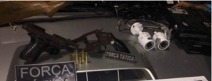 Após uma denúncia anônima repassada a Coordenadoria Integrada de Operações de Segurança (Ciops), acerca de indivíduos armados que estariam na Travessa Bela Vista, no bairro Cigana, composições policiais diligenciaram até o ponto, onde localizaram uma dupla. Rômulo Rodrigues de Sousa (21) – conhecido por “Zoi” – com duas passagens pela Polícia por tentativa de homicídio; e um menor de 16 anos, foram revistados pelos policiais, mas com eles não foi encontrado nenhum material ilícito. Contudo, seguindo com uma busca nas proximidades, a Polícia apreendeu três armas de fogo, sendo uma pistola calibre 765, com dez munições; um revólver calibre 38, municiado; e uma espingarda tipo socadeira, que estavam escondidas em um matagal próximo ao local onde ocorreram as abordagens. Ao serem indagados, os suspeitos negaram serem proprietários das armas.