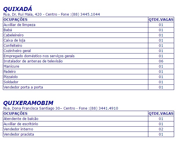 Para Quixadá e Quixeramobim existem vagas disponíveis para auxiliar de limpeza, cabeleireiro, caixa, auxiliar de escritório, vendedor, entre outros.