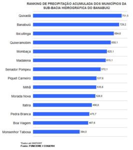 Segundo informações da gerência regional da Cogerh em Quixeramobim que elaborou um ranking das chuvas observadas no ano de 2017 até o dia 26 de julho nas 14 cidades da Bacia Hidrográfica do Banabuiú, os municípios de Quixadá com 751.5mm, Banabuiú com 729.2mm e Ibicuitinga com 684.6mm, acumularam chuvas acima da média histórica que é de 681.9mm, essa marca não era registrada em nenhum município da bacia desde o ano de 2011.