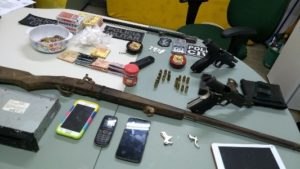 No local, os agentes de segurança apreenderam duas pistolas calibre ponto 40, uma espingarda de fabricação caseira, um cano de espingarda cal. 28, peças de um revólver, além de pequena quantidade de entorpecentes.