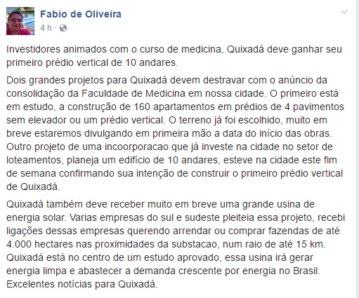 De acordo com o corretor de imóveis Fábio de Oliveira, que é sócio da imobiliária Cometa – uma das maiores de Quixadá – dois grandes projetos devem destravar após o anúncio da curso de medicina no município. As informações foram divulgadas através de suas redes sociais.
