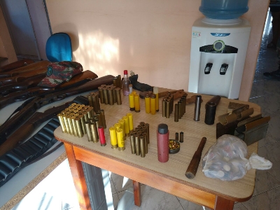 No total, foram apreendidas sete espingardas de diversos calibres, três espingardas artesanais, duas garruchas, sendo uma cal. 22 e outra artesanal, dois revólveres cal. 38, uma carabina cal. 38, 158 cartuchos e calibradores de cartuchos, além de acessórios para recarga e caça. Na ofensiva, aves silvestres e partes de animais, como pele e chifre, também foram recolhidos.