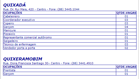 Para Quixadá e Quixeramobim existem vagas disponíveis para cabeleireiro, garçom, manicure, frentista, entre outros.