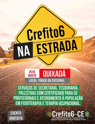 O Conselho Regional de Fisioterapia e Terapia Ocupacional da Sexta Região do Estado traz a Quixadá no próximo sábado (26) o projeto “Crefito-6 na Estrada” onde estarão sendo oferecidos aos profissionais serviços de secretaria, tesouraria, fiscalização consultoria de carreira e palestra.