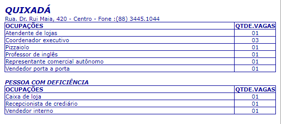 Para Quixadá existem vagas disponíveis para atendente de lojas, professor de inglês, vendedor porta a porta, entre outros. Existem ainda vagas ofertadas para pessoas com deficiência.