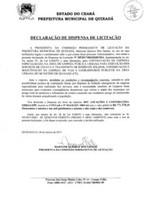 Em Quixadá, a empresa investigada por está envolvida com supostas fraudes em licitações em Pacajus, A RPC Construções e Locações, mantém contratos com a prefeitura da Terra dos Monólitos, sendo inclusive, uma das contratadas que mais “ganhou” com a atual gestão municipal. Em 03/01/2017, mediante o Decreto nº 003/2017, o prefeito de Quixadá, Ilário Marques (PT), decretou estado de emergência financeira no Município, com isso utilizou o decreto de emergência para realizar contratos sem a realização de licitação e um deles foi o procedimento de dispensa nº DP2-17/001 com a empresa. Com esse contrato, somente no início do ano, o valor pago a empresa foi de quase R$ 800.000,00 (oitocentos mil reais) para o serviço de limpeza urbana, com prazo contratual de três meses de duração, de acordo com uma Declaração de Dispensa de Licitação publicada pelo próprio executivo quixadaenses.
