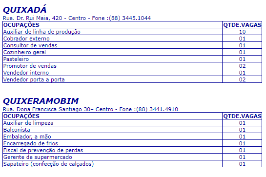 Os interessados em uma das vagas apresentadas na lista deverá se dirigir a uma unidade do Sine/IDT que em Quixadá fica localizada na Rua Dr. Rui Maia nº 420, Centro, e em Quixeramobim na Rua Dona Francisca Santiaga, nº 30, Centro. Importante ressaltar que não serão repassadas por telefone, as pessoas devem se deslocar até um dos escritórios do Sine.