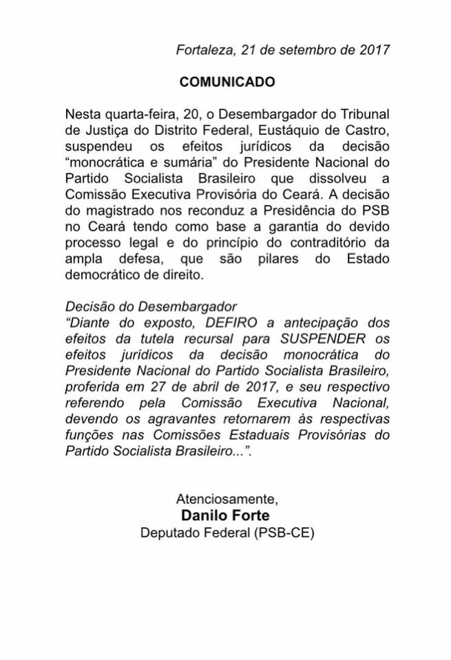 Nesta quinta-feira (21) divulgou o parlamentar divulgou um comunicado com a decisão do Desembargador do Tribunal de Justiça do Distrito Federal, Dr. Eustáquio de Castro, que suspendeu a decisão do diretório nacional e dissolveu a Comissão Executiva Provisória do Ceará. A decisão do magistrado reconduz o deputado Danilo Forte a Presidência do PSB no Ceará.