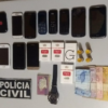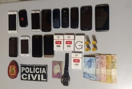 A equipe da Polícia Civil da cidade fez buscas no estabelecimento, onde encontraram 13 celulares, cartões de crédito, uma pequena quantia em dinheiro, munições de espingarda calibre 20 e algumas carteiras de cigarro importados ilegalmente. Os cigarros estavam com Felipe Nascimento de Souza (19), sem antecedentes, que foi autuado por receptação, pagou fiança e foi liberado.