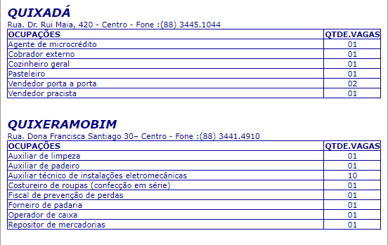 Confira abaixo somente as vagas para as cidades de Quixadá e Quixeramobim, divulgadas pelo Sine/IDT.