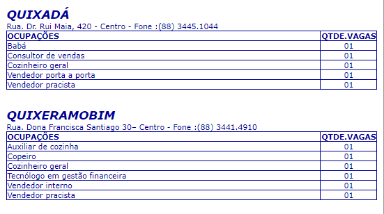 Confira abaixo somente as vagas para as cidades de Quixadá e Quixeramobim, divulgadas pelo Sine/IDT.