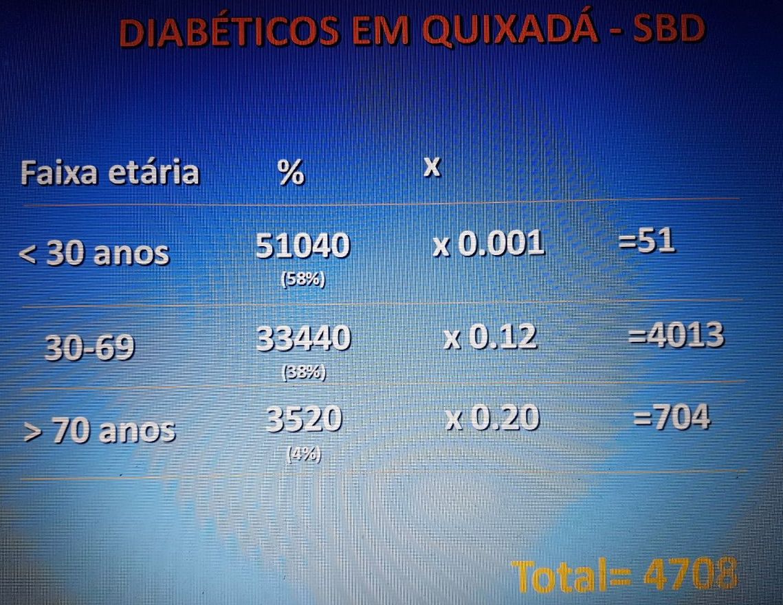 De acordo com a estatística da Sociedade Brasileira de Diabetes o município de Quixadá deve contar atualmente com quase 5.000 pessoas portadoras da doença, com incidência maior na faixa etária de 30 a 69 anos. Importante ressaltar que os danos causados pelo diabetes mal controlado, em sua maioria, são silenciosos, ocorrem lentamente por um longo período de tempo antes de serem notados. Segundo a SBD, no Brasil, de 45% a 50% das pessoas com diabetes não sabem que têm a doença e entre os que sabem, 20% não fazem nenhum controle. O não-controle do diabetes pode causar cegueira, amputação de membros, insuficiência renal, derrame cerebral, disfunção erétil, úlcera nos pés, depressão, entre outros problemas.