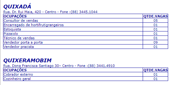 Confira abaixo somente as vagas para as cidades de Quixadá e Quixeramobim, divulgadas pelo Sine/IDT.