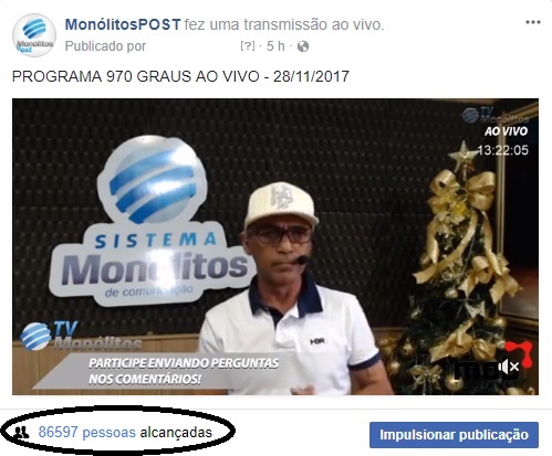 Nesta terça-feira (28) o programa 970 Graus alcançou quase 90 mil pessoas na página do Facebook do Monólitos Post, números impressionantes se levarmos em consideração o pouco tempo de existência da TV Monólitos. O segredo desse sucesso? Uma equipe de profissionais preparados e qualificados formada por Everardo Filho, DJ Jacaré, Herley Nunes, Everardo Gomes, Renato Evillin, Wanderley Barbosa, Felipe Sousa, e muitos outros que se dedicam diuturnamente para levar o melhor para você que nos acompanha diariamente.