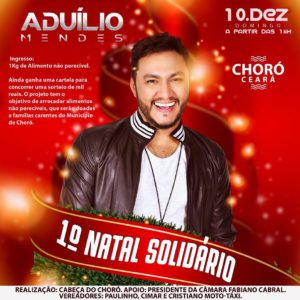 No próximo domingo (10), será realizado a partir das 16 horas no Campo Society O Fom, o 1º Natal Solidário do município de Choró, o evento solidário tem como organizadores o Presidente da Câmara dos Vereadores de Choró, Fabiano Cabral, Cabeça de Choró, além dos vereadores Cimar, Paulinho e Cristiano Moto-taxi. Para participar do evento, cada pessoa deverá levar 1Kg de alimento não perecível que serão doados as famílias carentes na noite de Natal. No ato da entrega do alimento cada pessoa ainda receberá uma cartela para concorrer a um sorteio de R$ 1.000,00 (Mil reais).