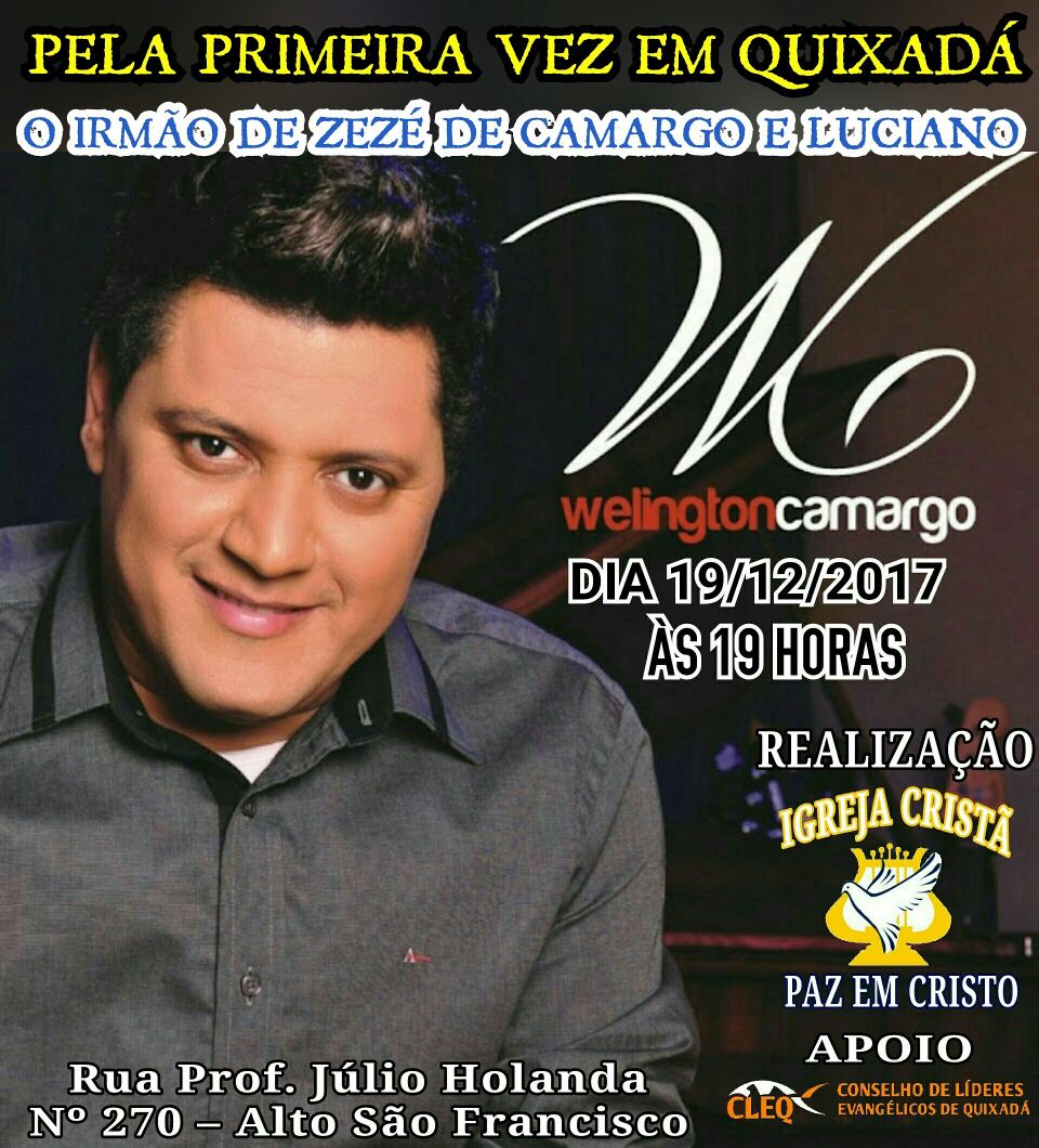 A Igreja Cristã Paz em Cristo, com o apoio do Conselho de Líderes Evangélicos de Quixadá – CLEQ realiza nesta terça-feira (19) a partir das 19 horas um momento de louvor, adoração e testemunho de vida, protagonizado pelo cantor Wellington Camargo, irmão da dupla Zezé de Camargo e Luciano.