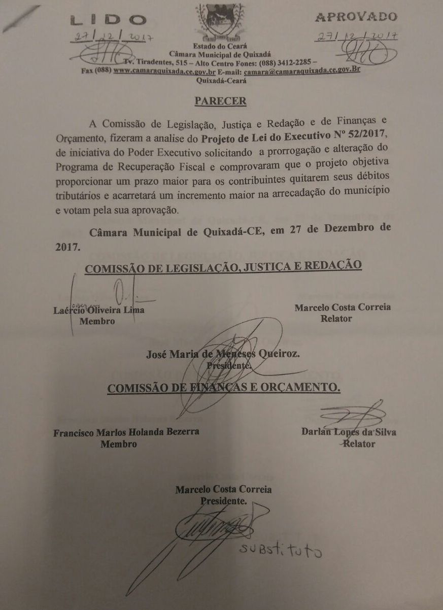 Mas os graves erros nos projetos do prefeito não pararam por aí. Isso porque o projeto de lei complementar nº 002/2017, que aumentou os impostos e taxas do município foi aprovado pelo voto dos vereadores da base aliada de Ilário Marques com um parecer assinado por um vereador que não é membro da comissão de finanças e orçamento da Câmara Municipal. Os parlamentares que compõe a referida comissão são: Marcelo Ventura (presidente); Darlan Lopes (relator) e Francisco Marlos Holanda (membro). Ocorre que Marcelo Ventura, presidente da comissão, faltou a sessão extraordinária e o vereador Francisco Marlos não assinou o parecer porque discordou do projeto, nesse caso então o parecer rejeitava o projeto do prefeito, já que apenas Darlan Lopes assinava.
