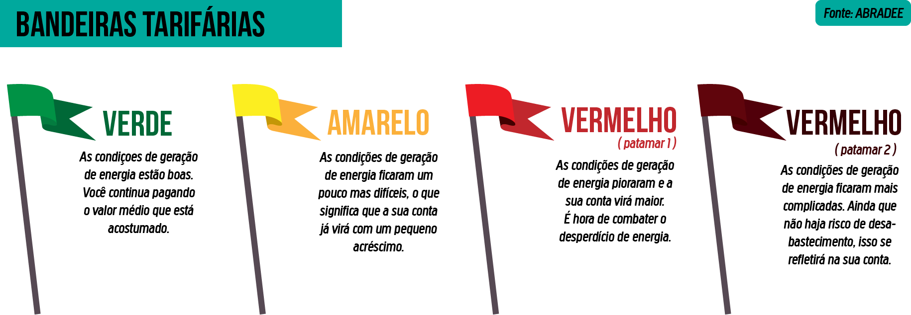 As Bandeiras Tarifárias, por sua vez, refletem os custos variáveis da geração de energia elétrica. Dependendo das usinas utilizadas para gerar a energia, esses custos podem ser maiores ou menores. Antes das Bandeiras, essas variações de custos só eram repassadas no reajuste seguinte, o que poderia ocorrer até um ano depois. Com as Bandeiras, a conta de energia passou a ser mais transparente e o consumidor tem a informação no momento em que esses custos acontecem. Em resumo: as Bandeiras refletem a variação do custo da geração de energia, quando ele acontece.