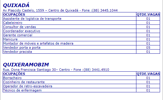 Os interessados em uma das vagas apresentadas na lista deverá se dirigir a uma unidade do Sine/IDT que em Quixadá fica localizada no Terminal Rodoviário, e em Quixeramobim na Rua Dona Francisca Santiaga, nº 30, Centro. Importante ressaltar que não serão repassadas por telefone, as pessoas devem se deslocar até um dos escritórios do Sine.