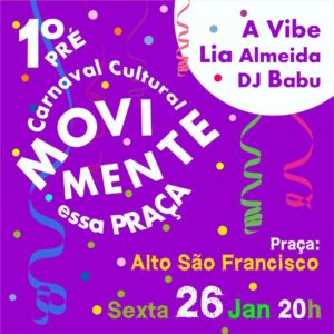 O evento terá como atrações DJ Babu, Lia Almeida e Banda e banda A Vibe, os artistas apresentarão um repertório empolgante de clássicos do frevo pernambucano e baiano, axé, reggae, maracatu e baião, além das tradicionais marchinhas de carnaval.