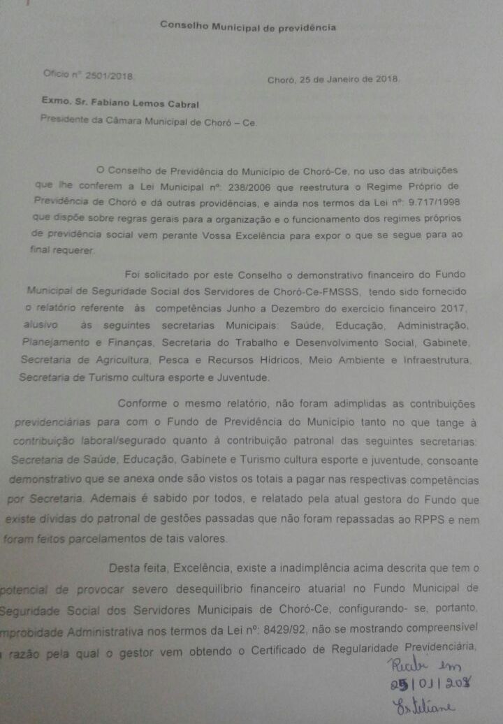 Após uma vida inteira dedicada ao trabalho, contribuição previdenciária e, por fim, planos para aposentadoria: viver de brisa, viajar ou, simplesmente, ficar em casa vendo TV com a família já que o sustento da casa estaria garantido. Nada disso! Alguns servidores da Prefeitura Municipal de Choró podem ver seus sonhos se transformarem em pesadelo. Isso porque, a gestão municipal, sob o comando do Prefeito Marcondes Jucá, terminou o ano de 2017 com um rombo milionário na previdência do município. A denúncia foi feita por meio do Conselho Municipal de Previdência do Choró e enviada para a Câmara Municipal.