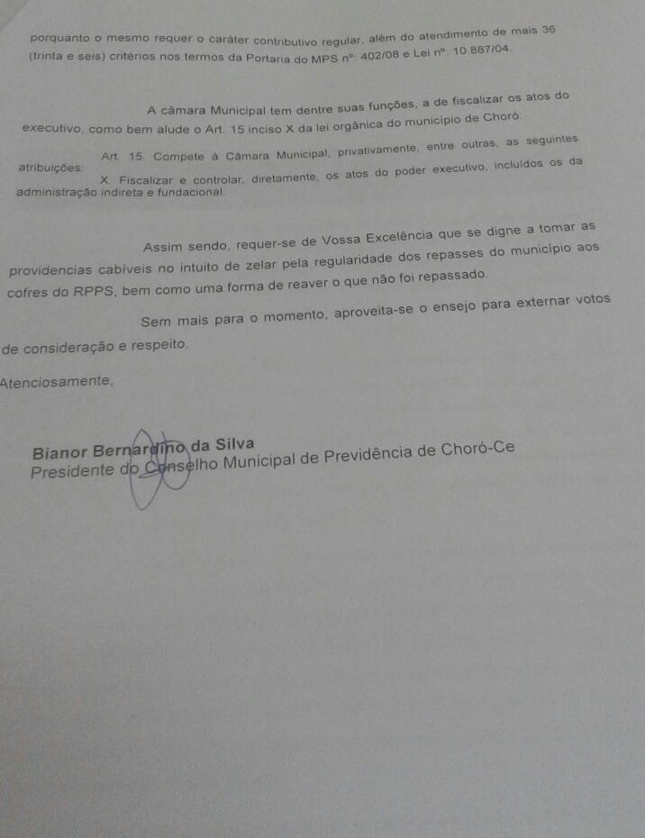 Os integrantes do conselho afirmam que todos esses débitos milionários podem provocar um desequilibro financeiro no Fundo Municipal de Seguridade Social dos Servidores do Município de Choró. Finalizando, eles pedem providências dos parlamentares para que fiscalizem as ações do Poder Executivo a fim de garantir a regularidade dos repasses do município para o cofre da previdência, bem como para reaver os valores que não foram repassados.