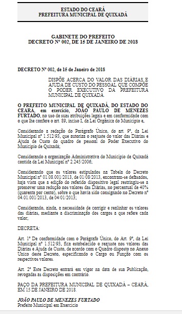 O prefeito de Quixadá, Ilário Marques (PT), parece não se importar muito com as críticas da população e segue comandando a cidade em benefício próprio. Por conta de sua luxuosa viagem de férias pela Europa, ele autorizou e o prefeito em exercício, João Paulo de Menezes Furtado, assinou o Decreto nº 002/2018, que visa aumentar o valor das diárias na prefeitura de Quixadá. Um aumento que chega a quase 50% nos valores de referência das diárias pagas pelo município a ele próprio e ao vice-prefeito. Mas a farra com dinheiro público não para por ai, para os secretários o aumento chega a desmoderado 150% nos valores das diárias. A notícia desse aumento se transformou num imenso sentimento de revolta entre os quixadaenses em razão da milionária despesa que será desembolsada apenas com diárias para o prefeito, vice e seus secretários, incluíndo nessa lista a própria filha de Ilário Marques, Maíra Marques, que é secretária de administração.