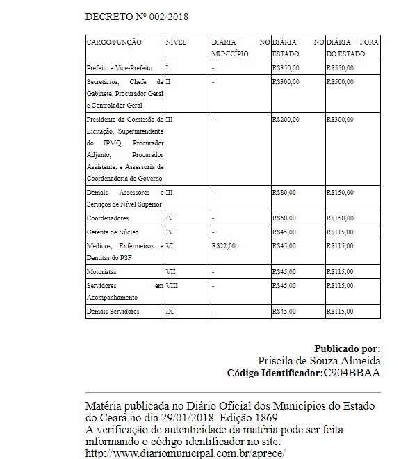 No ano de 2017, até o mês de novembro, por exemplo, Ilário Marques recebeu dos cofres da prefeitura de Quixadá o equivalente a R$ 12.960,00 referente apenas ao pagamento de diárias. Com o aumento, esse valor pula para R$ 18.300,00, que correspondeu praticamente a um 14º salário para o prefeito. Para os secretários a farra é mais generosa, o campeão de diárias foi o secretário de agricultura, Kléber Júnior, que embolsou, até o mês de novembro do ano passado, mais de 10 mil reais em diárias, com o aumento o secretário embolsaria mais de 20 mil reais. Ou seja, o gasto com diárias quase se equivale ao pagamento da folha salarial mensal, havendo, assim, indícios claros de que agentes públicos possam está usando as diárias como subterfúgio para aumentar os próprios salários.