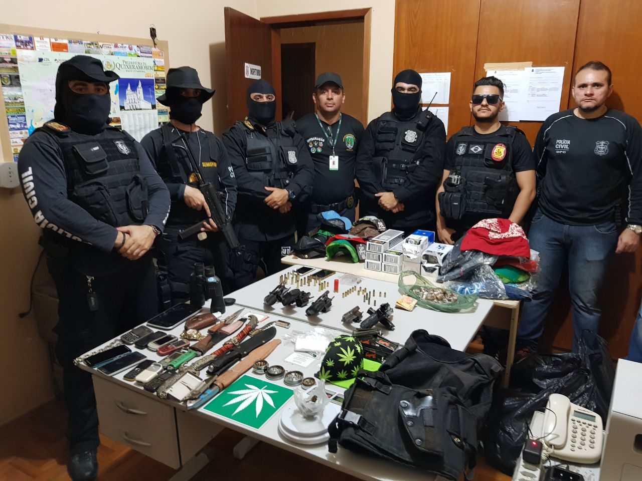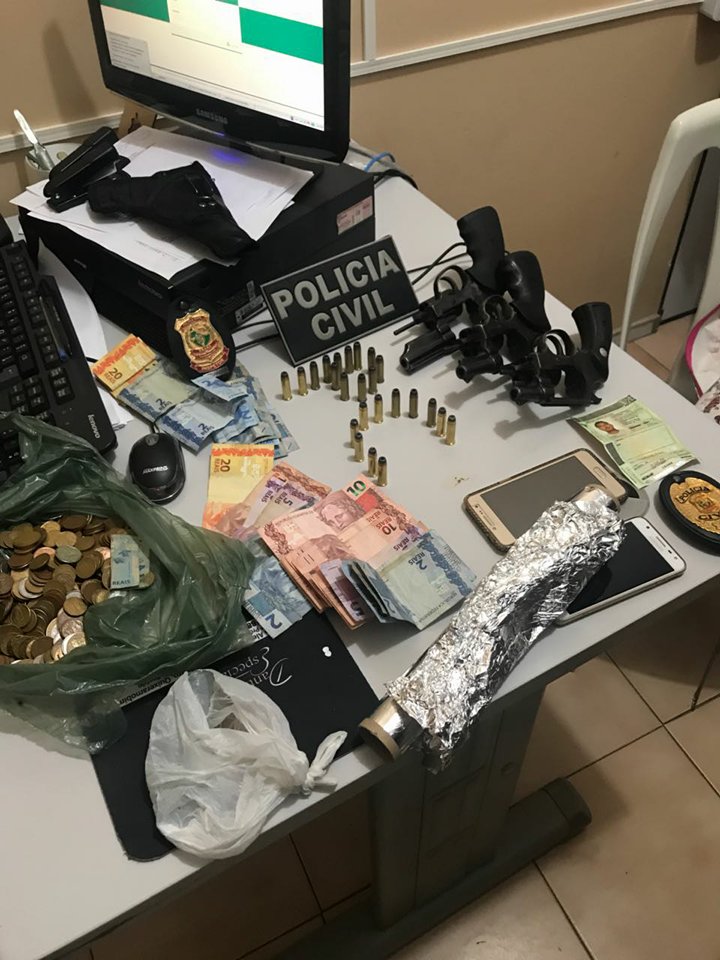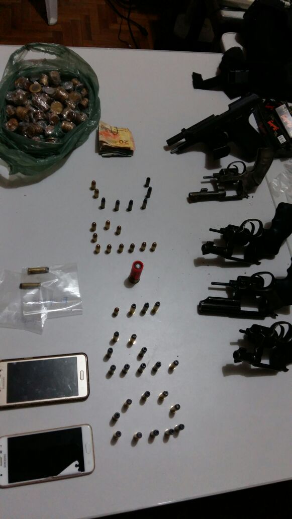 Ainda duranta a operação foram apreendidos 05 revólveres, 43 munições de vários calibres, 01 balança de precisão, 01 binóculo, 01 capa de colete, 11 pinos de cocaína, 17g de maconha e a quantia de R$ 240,00 em espécie.