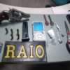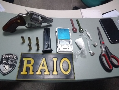 Na noite dessa segunda-feira (26), em Canindé, após uma abordagem realizada pelas equipes da Força Tática e do Raio, foi encontrado um carregador de pistola com um indivíduo que reside em Santa Quitéria. Em continuidade das diligências, foi feito deslocamento até a referida cidade, onde, em uma casa no bairro Boa Vida, foram localizados um revólver calibre 38, com cinco munições, uma pequena quantidade de cocaína, maconha e uma balança de precisão.