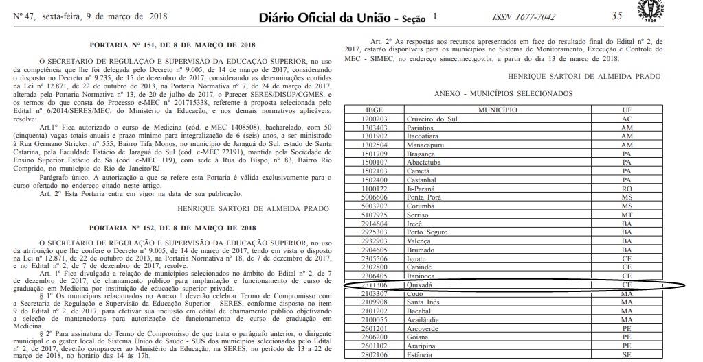 O Ministério da Educação publicou no Diário Oficial da União desta sexta-feira (09) a portaria nº 152 confirmando a implantação de curso de graduação em medicina por instituições de ensino superior privada em 28 municípios brasileiros, entre as cidades selecionadas estão Iguatu, Canindé, Quixadá e Itapipoca.