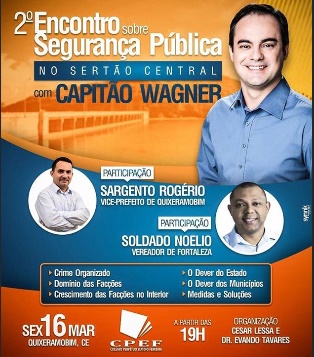 Falar sobre segurança pública é algo bastante necessário nos dias atuais, e na próxima sexta-feira (16) será realizado no município de Quixeramobim o 2º Encontro sobre Segurança Pública no Sertão Central com o Deputado Estadual Capitão Wagner (PROS). Entre alguns temas que serão debatidos estão o crime organizado, o domínio das facções criminosas, crescimento das facções no interior do estado, o dever do estado e dos municípios e ainda medidas e soluções para combater a violência.