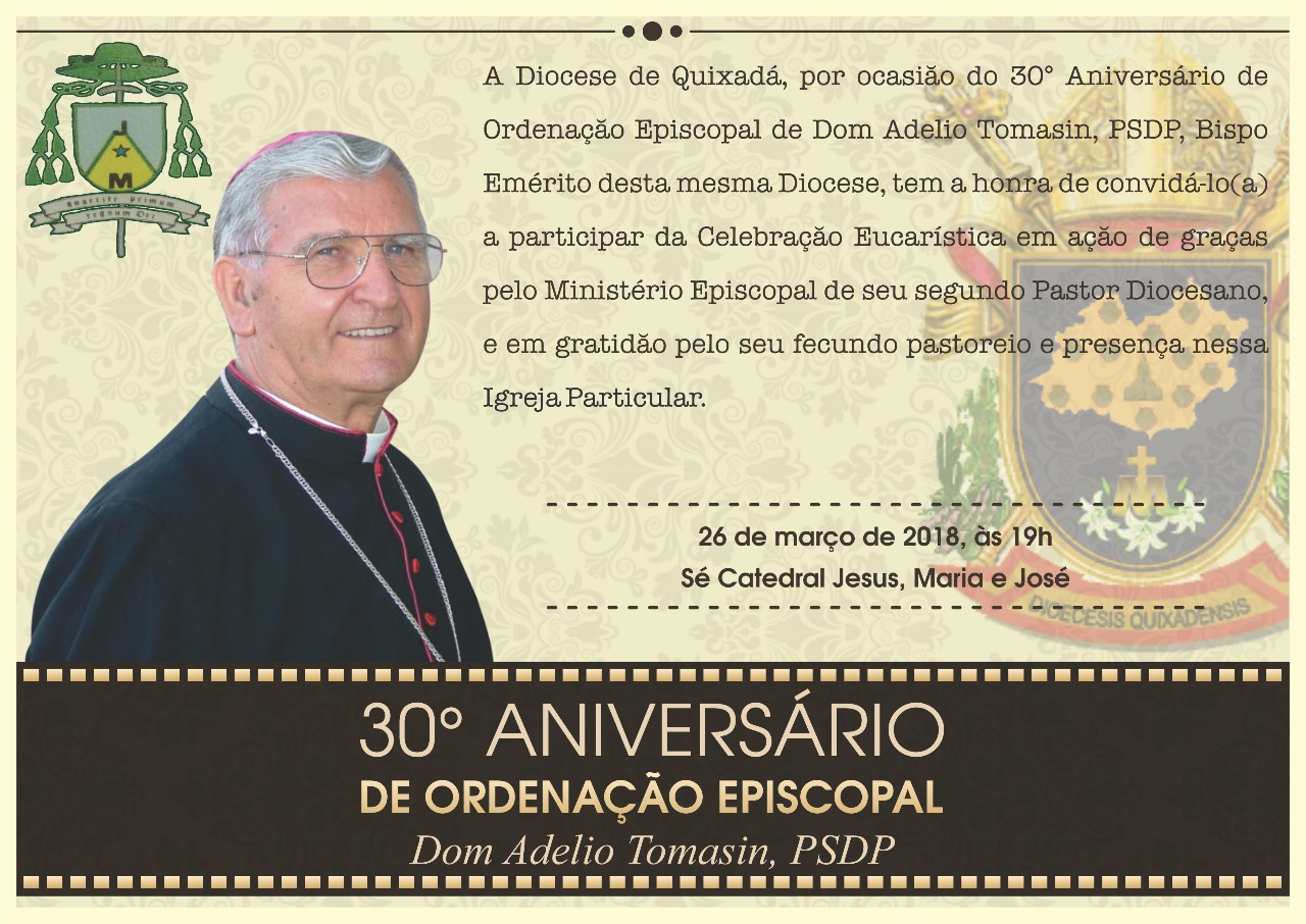 Um dos maiores benfeitores de Quixadá celebra na próxima segunda-feira (26) trinta anos de Ordenação Episcopal, Dom Adélio Tomasin de 87 anos foi eleito Bispo da Diocese de Quixadá em 26 de março de 1988, pelo então Papa João Paulo II e recebeu a Ordem do Episcopado de Dom Cláudio Colling, então Arcebispo de Porto Alegre, tomando posse no dia 29 de maio do mesmo ano.