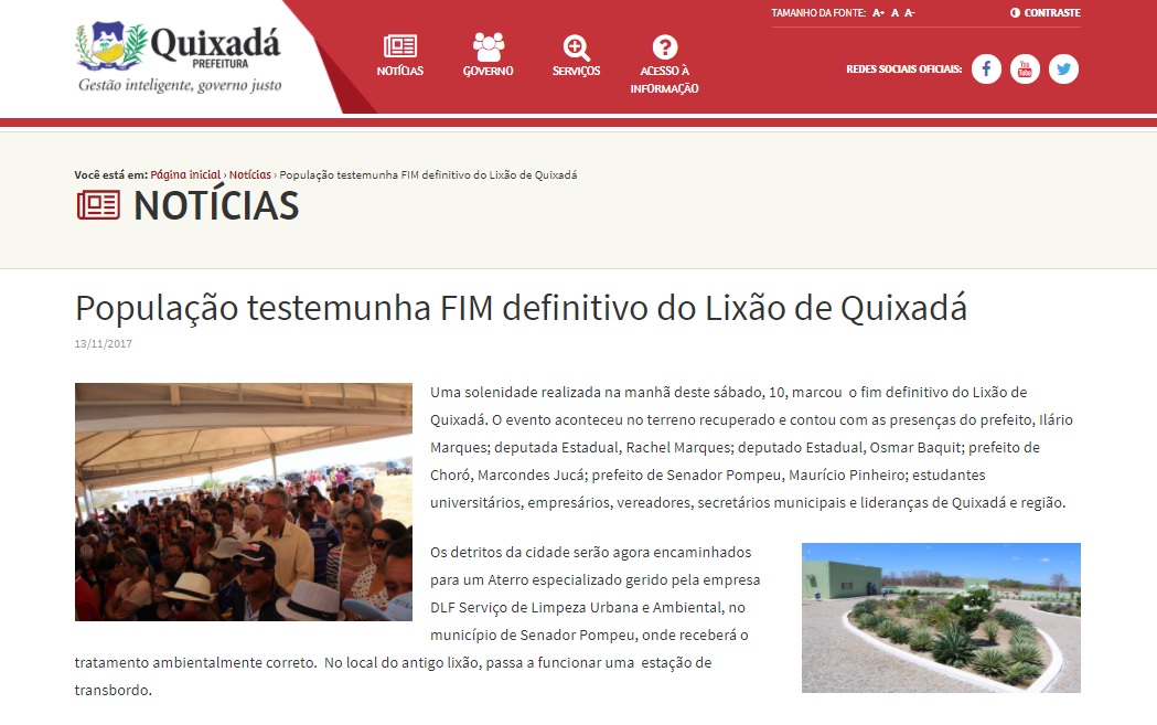 Durante o evento realizado em novembro de 2017 para anúncio do fim do lixão, o alcaide local, prevendo que ação daria certo, optou por propagandear, em demasia, o fato. Ele convidou os prefeitos de Choró, Marcondes Jucá; de Senador Pompeu, Maurício Pinheiro; estudantes universitários, empresários e lideranças da Terra dos Monólitos, bem como da região.