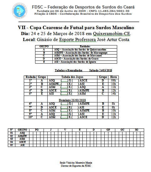 O município de Quixeramobim, no Sertão Central, sediará neste final de semana, sábado (24) e domingo (25), a 7ª Copa de Futsal para Surdos. Serão 05 equipes que irão disputar o título da competição, que reunirá associações dos surdos das cidades de: Fortaleza, Iguatu, Maranguape, Maracanaú e Quixeramobim.